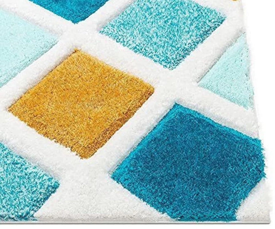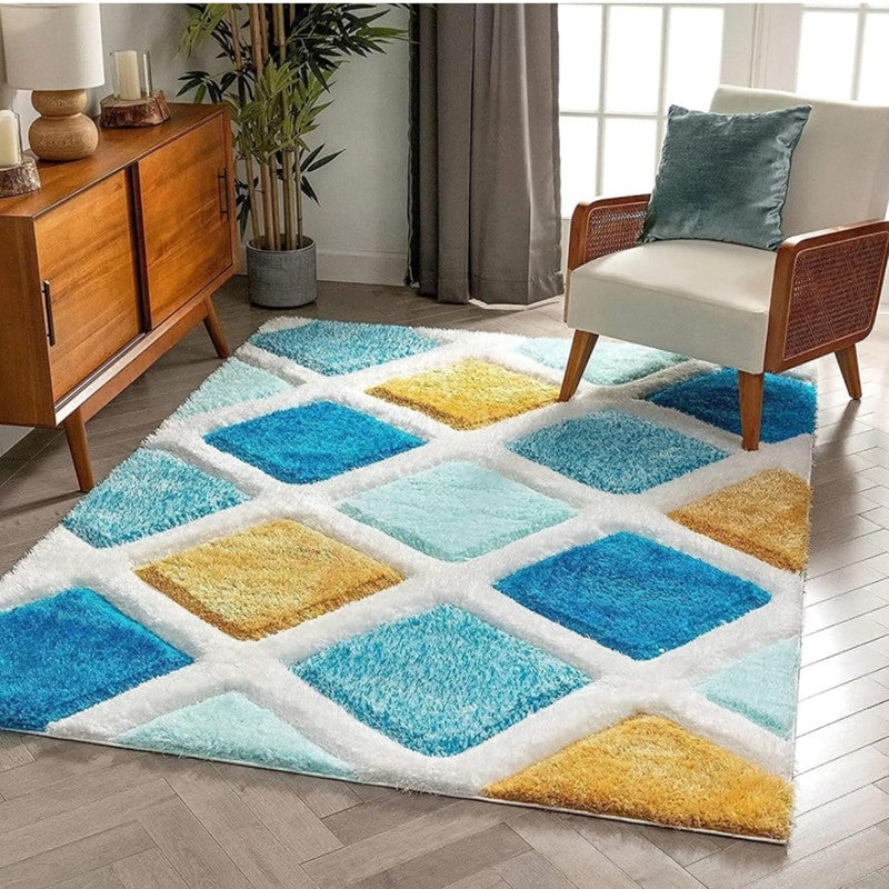 Blue & Mustard Diamond Pattern Shaggy Carpet